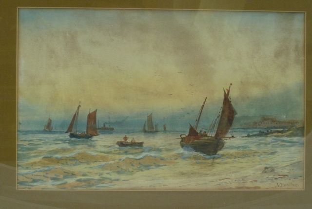 A pair of scenes, fishing sloops in a choppy sea before a breakwater
