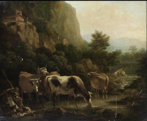 A shepherd and his dog grazing cattle before an Italianate landscape