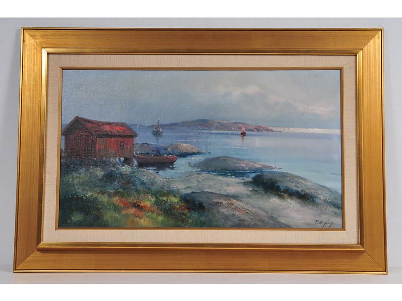 Kustmotiv med sjöbod och båtar