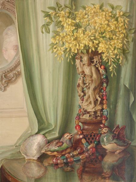 | Still Life Study of Flowers emanating from a Japanese Statue beside Ornaments on a Table | |