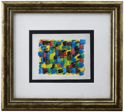 acquerello su cartoncino postale 13,2x16,6 cm, firma in basso a destra, firma, anno, dedica dell'artista, francobollo, timbro postale, timbro "Mail Art - archivio Eraldo Di Vita" e indirizzo del ricevente "Eraldo Di Vita", attesta | |