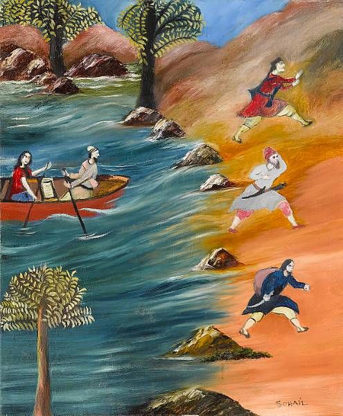 Figures fleeing the approach of a boat