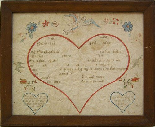| fraktur with central script in heart surrounded by flowers, angel, etc., | |