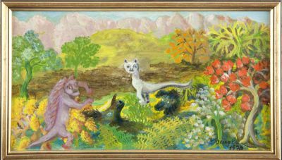 Pejzaż fantastyczny ze zwierzętami