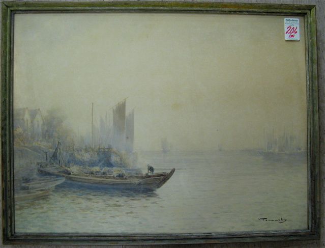 | The first a harbor scene with fishing boats and fishermen, sail boats in the distance | |