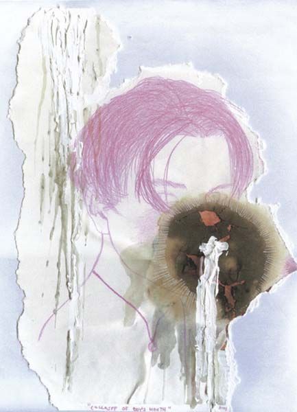 | Acrylic wax, colored pencil and chalk with printed paper collage on paper | |