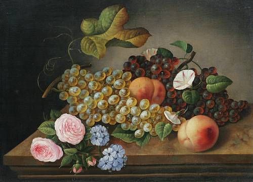 Black and green grapes, peaches, pink roses and other flowers on a stone ledge