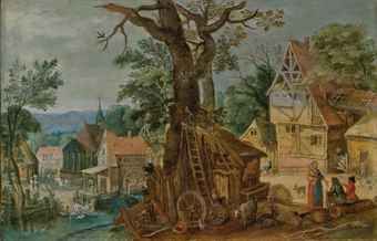 | Un village avec des paysans discutant près d'une étable et un moulin à eau avec monogramme 'M' (en bas au centre, sur une roue) | |