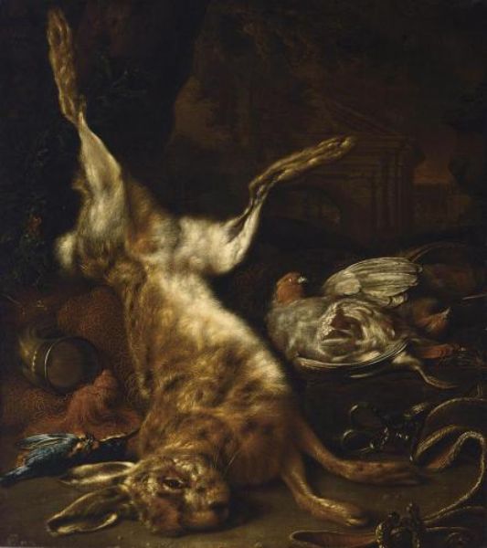 | A HUNTING STILL LIFE WITH A HARE, TWO PARTRIDGES AND A KINGFISHER | |