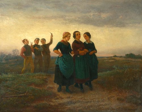 | Junge Burschen werben um Mädchen in einer Dreie... | |