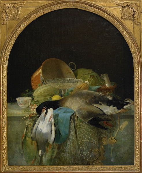 | Stilleben med frukter, kopparkastrull och fåglar | |