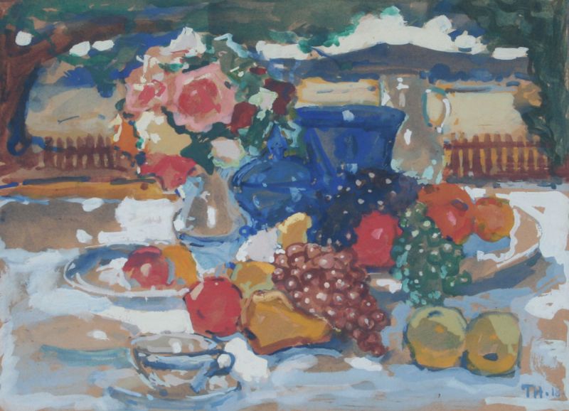 Still Life Plein Aire Table Setting with Roses, Glassware and Fruit
