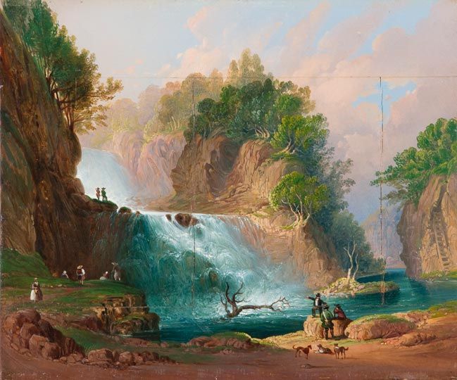 Táj vízeséssel és kirándulókkal