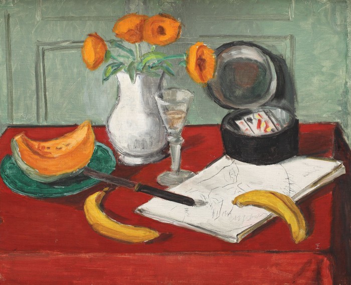 Natură statică cu dovleac, banane și autoportret