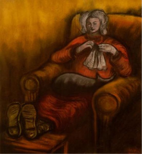 Showing A Woman Knitting, In A Large Armchair