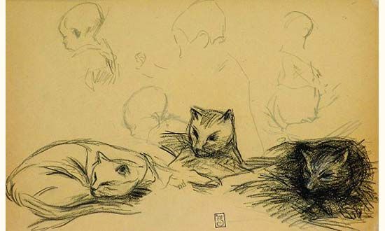 Etude de chats et de têtes d'enfant