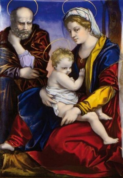 Plaque rectangulaire bombée à décor émaillé polychrome figurant la Sainte Famille
