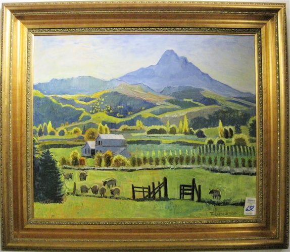 Oregon landscape with farm, crops and sheep, Mt. Hood in background