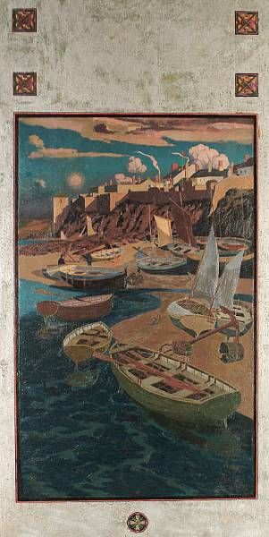 | Harbour scene, believed to be Appledore in Devon, with decoratif cartouches, | |