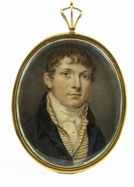 | A gentleman, head and shoulders, wearing a striped waistcoat and a blue coat, facing right | |