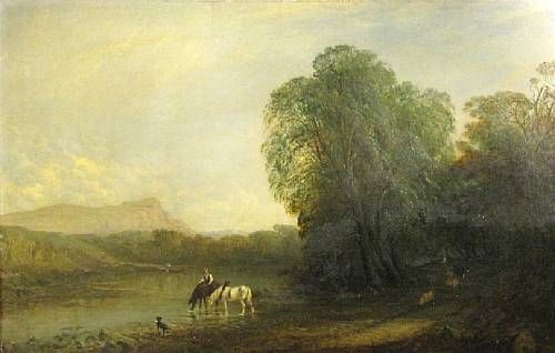 | A river landscape with a rider, two horses and a dog at the water's edge | |