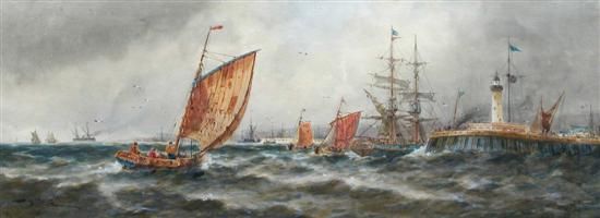 | Making for Harbour - Sailing Ships in Squally Seas, passing a Lighthouse | |