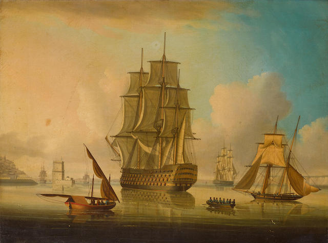 A British 1st Rate ship-of-the-line off Belem Castle on the Tagus