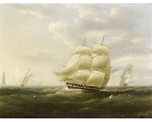 | A British frigate bowling down the Channel on a breezy day past the Eddystone lighthouse | |