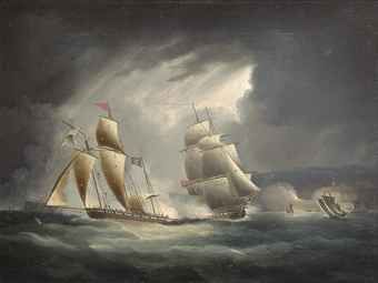 | A Royal Navy frigate engaging and chasing a pirate lugger off the south coast | |