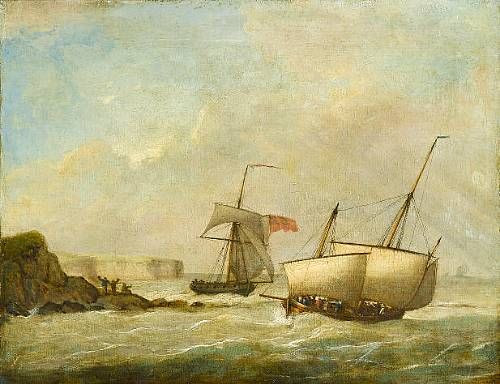 | An armed cutter of the Royal Navy rounding a headland and surprising a lugger heading inshore | |