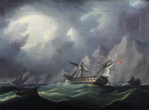 | Marine scene with British frigate driven on the rocks, survivors entering a lifeboat off a foreign shore | |