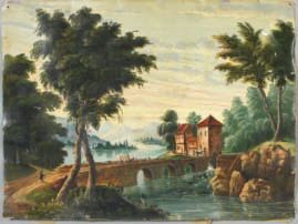 LANDSCAPE WITH BRIDGE ACROSS A MILL STREAM.