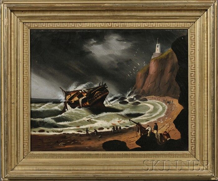 | Shipwreck off a Rocky Coast with Figures Gathering Debris and Distant Lighthouse | |
