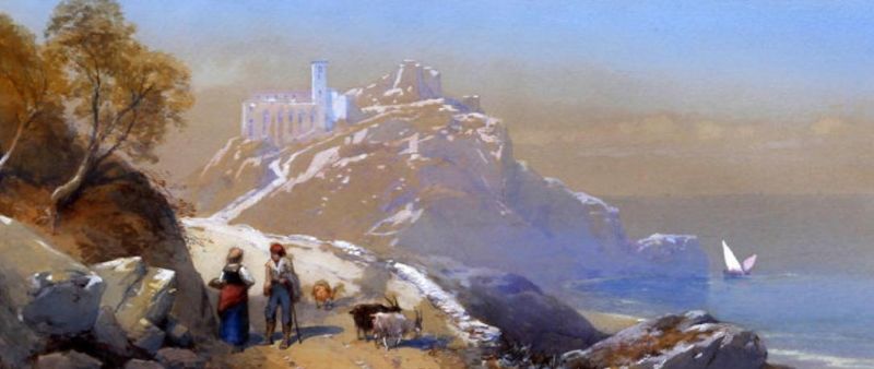 | Figures on a hilly path with a monastery overlooking the sea | |