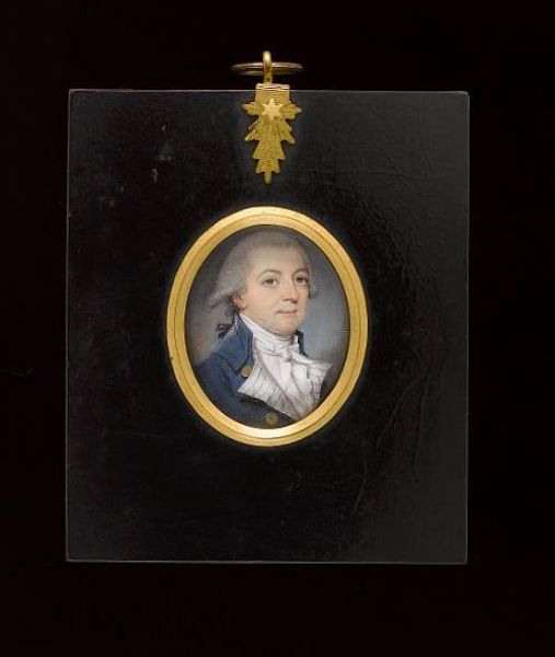| A Gentleman, wearing blue coat with gold buttons, blue striped white waistcoat, frilled chemise and tied cravat, his hair powder | |