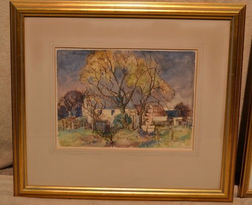 Watercolor depicting farm buildings