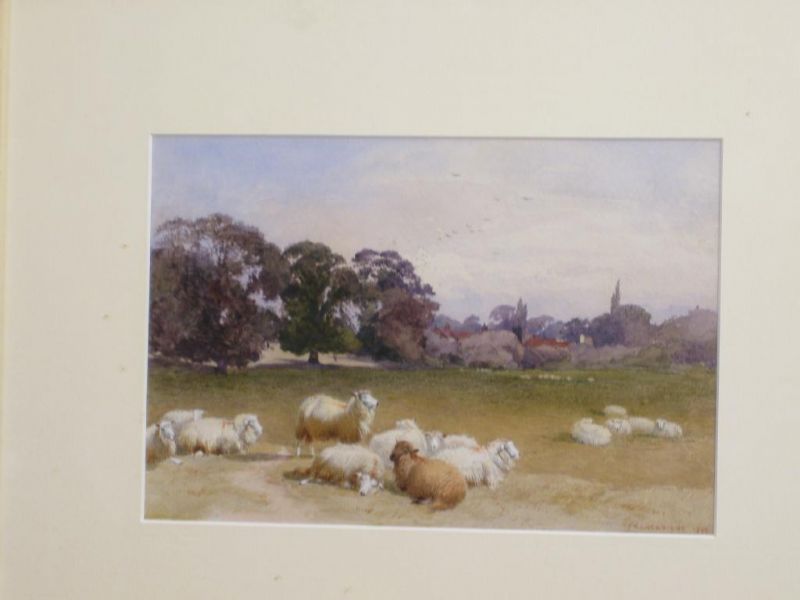 | Sheep resting in a meadow, with distant village buildings among trees | |