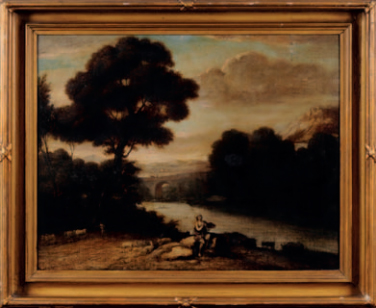 | Arcadian landscape, a shepherd and sheep in the foreground, river and bridge beyond | |