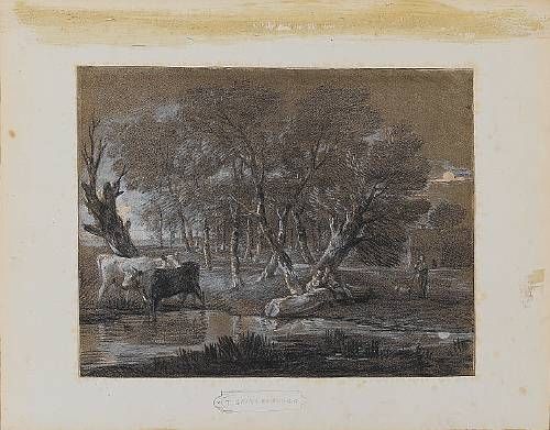 | Wooded landscape with cows beside a pool, figures and cottage | |