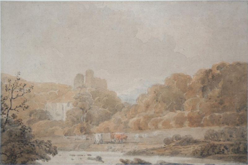 | Cattle in a wooded landscape, a castle (possibly Okehampton) on a peak beyond | |