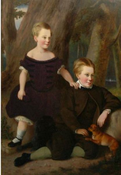 Portrait of Two Children with Their Dog, Seated in a Wooded Interior