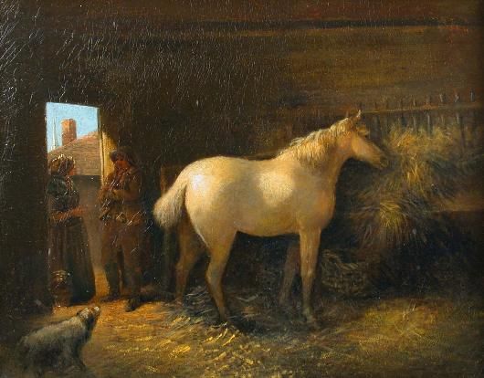 A Grey Pony with a Hound in a Stable