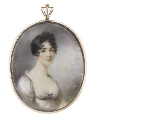 | Mrs Mary Gaskell (d.1845), wearing white dress edged with lace, sapphire brooch at her corsage, her raven hair braided, curled a | |