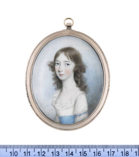 | Mary Harrop, wearing white dress with frilled trim, blue sash and matching ribbon at her sleeve, her long locks worn loose. | |