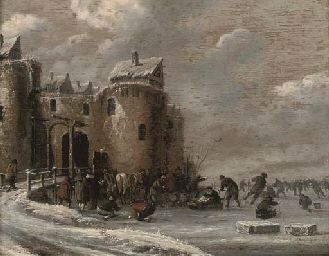 | A frozen winter landscape with skaters by a fortified town gate | |