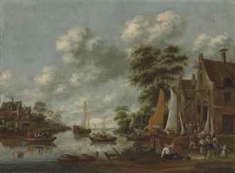 A river landscape with ferry boats and other vessels, figures disembarking by an inn