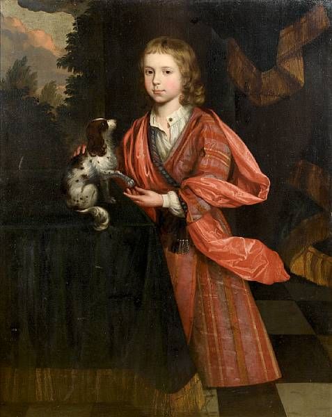 | Portrait of a young boy, three-quarter-length, in red costume, with a King Charles spaniel at his side, standing before a landsc | |