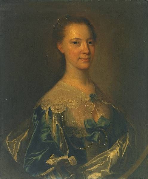 A portrait of Susanna Dacre, half-length, wearing a blue satin dress with blue ribbons