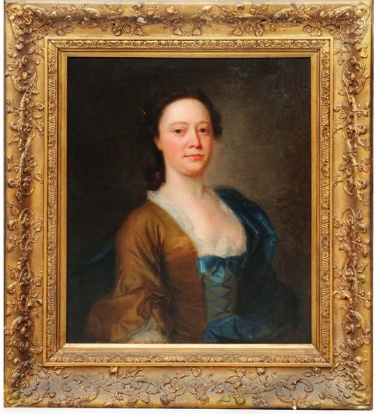 | Half length portrait of a lady wearing a brown dress with blue shawl | |