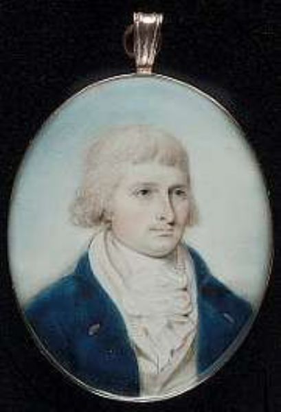 A Gentleman, wearing blue coat, white waistcoat and frilled chemise